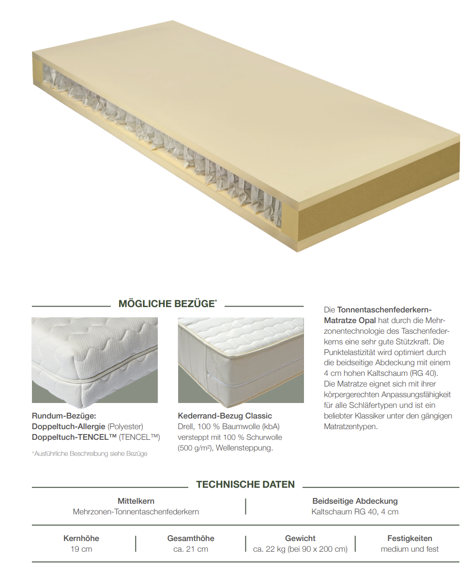 Die Tonnentaschenfederkern-Matratze Opal hat durch die Mehrzonentechnologie des Taschenfederkerns eine sehr gute Stützkraft. Die Punktelastizität wird optimiert durch die beidseitige Abdeckung mit einem 4 cm hohen Kaltschaum (RG 40). Die Matratze eignet sich mit ihrer körpergerechten Anpassungsfähigkeit für alle Schläfertypen und ist ein beliebter Klassiker unter den gängigen Matratzentypen.