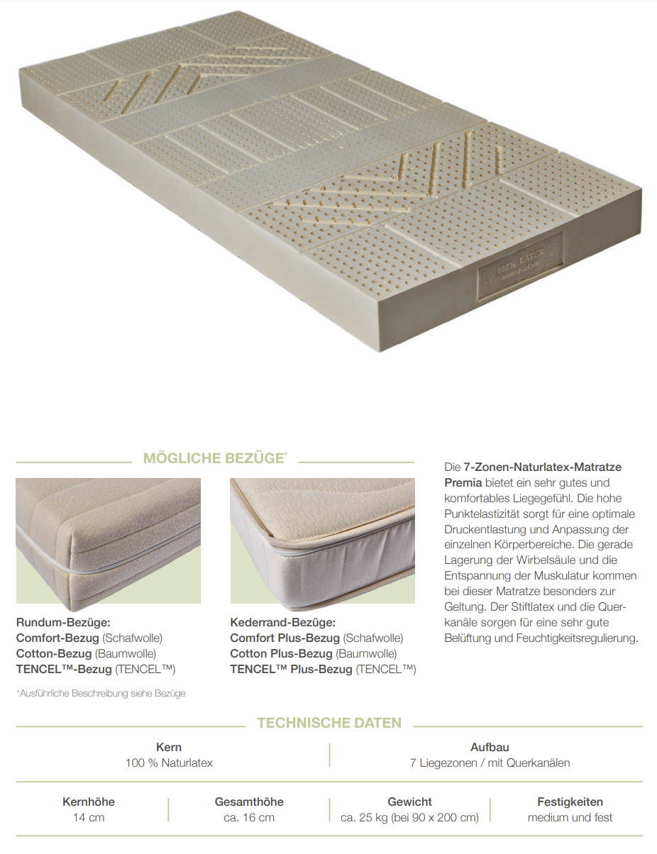 Die 7-Zonen-Naturlatex-Matratze Premia bietet ein sehr gutes und komfortables Liegegefühl. Die hohe Punktelastizität sorgt für eine optimale Druckentlastung und Anpassung der einzelnen Körperbereiche. Die gerade Lagerung der Wirbelsäule und die Entspannung der Muskulatur kommen bei dieser Matratze besonders zur Geltung. Der Stiftlatex und die Querkanäle sorgen für eine sehr gute Belüftung und Feuchtigkeitsregulierung. Kern: 100 % Naturlatex Aufbau: 7 Liegezonen / mit Querkanälen Kernhöhe: 14 cm  -  Gesamthöhe: ca. 16 cm Gewicht: ca. 25 kg (bei 90 x 200 cm) Härtegrad: medium und fest Rundum-Bezüge - wählbar:Comfort-Bezug (Schafwolle)Cotton-Bezug (Baumwolle)TENCEL-Bezug (TENCEL)* *Tencel ist die erste Cellulosefaser deren Funktionalität auf Basis von Fibrillen funktioniert. Fibrillen sind winzige Härchen, die hydrophil sind und somit für eine optimale Feuchtigkeitsaufnahme mit besten Klimaeigenschaften sorgen. Die Feuchtigkeit wird durch und durch aufgenommen und dann wieder abgegeben, im Gegensatz zu synt. Fasern, an denen die Feuchtigkeit nur an der Oberfläche abgelagert wird. Tencel® ist waschbar bis 60°C, daher ideal für Allergiker. großes Wasserbindevermögen kein Nährboden für Bakterien Nachhaltigkeit