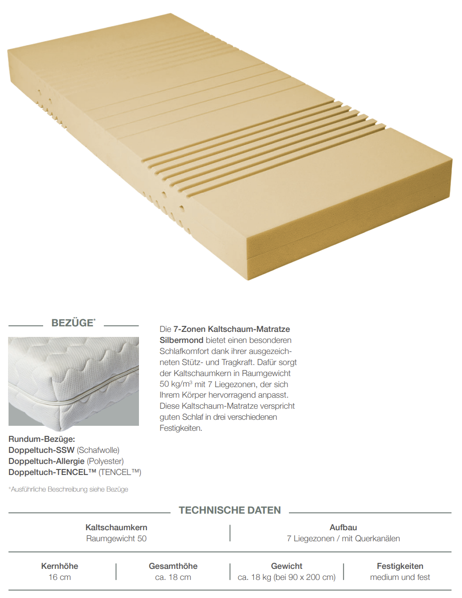 Die 7-Zonen Kaltschaum-Matratze Silbermond bietet einen besonderen Schlafkomfort dank ihrer ausgezeichneten Stütz- und Tragkraft. Dafür sorgt der Kaltschaumkern in Raumgewicht 50 kg/m³ mit 7 Liegezonen, der sich Ihrem Körper hervorragend anpasst. Diese Kaltschaummatratze verspricht guten Schlaf in zwei verschiedenen Festigkeiten.