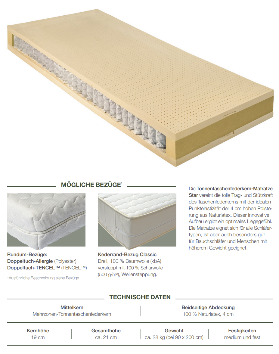 Die Tonnentaschenfederkern-Matratze Star vereint die tolle Trag- und Stützkraft des Taschenfederkerns mit der idealen Punktelastizität der 4 cm hohen Polsterung aus Naturlatex. Dieser innovative Aufbau ergibt ein optimales Liegegefühl. Die Matratze eignet sich für alle Schläfertypen, ist aber auch besonders gut für Bauchschläfer und Menschen mit höherem Gewicht geeignet.