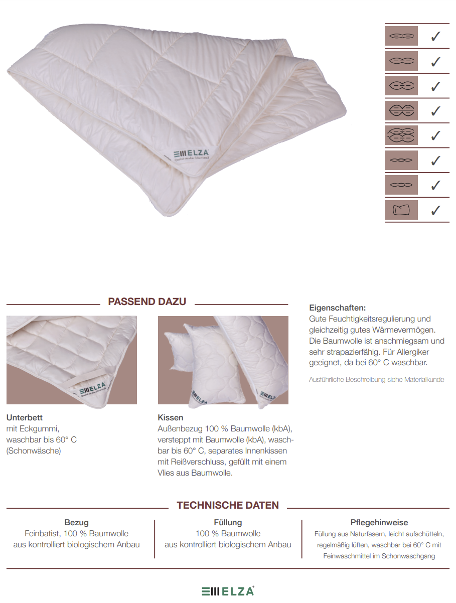 Eigenschaften: Gute Feuchtigskeitsregulierung und gleichzeitig gutes Wärmevermögen. Die Baumwolle ist anschmiegsam und sehr strapazierfähig. Für Allergiker geeignet, da bei 60°C waschbar.