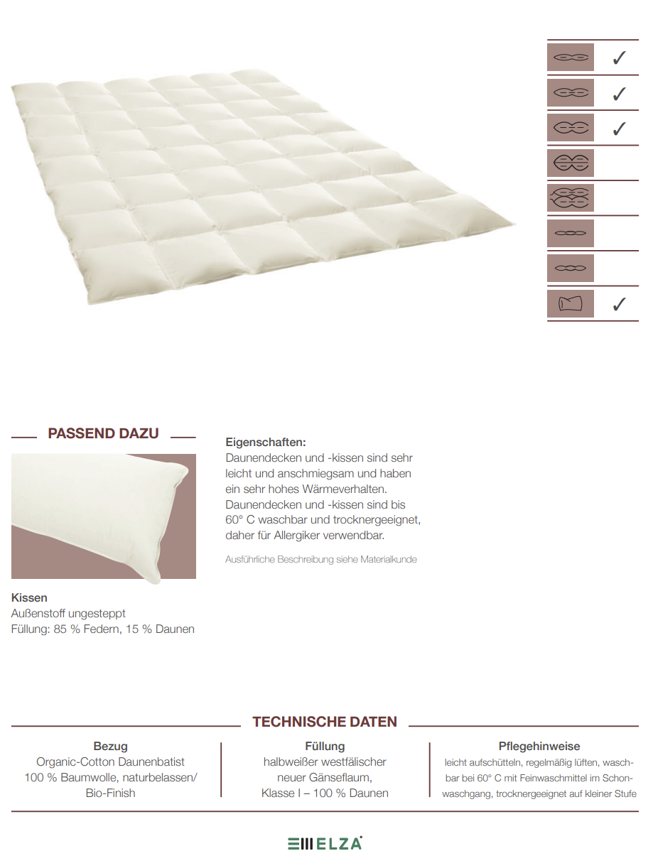 Daunendecken und -Kissen sind sehr leicht und anschmiegsam und haben ein sehr hohes Wärmeverhalten.