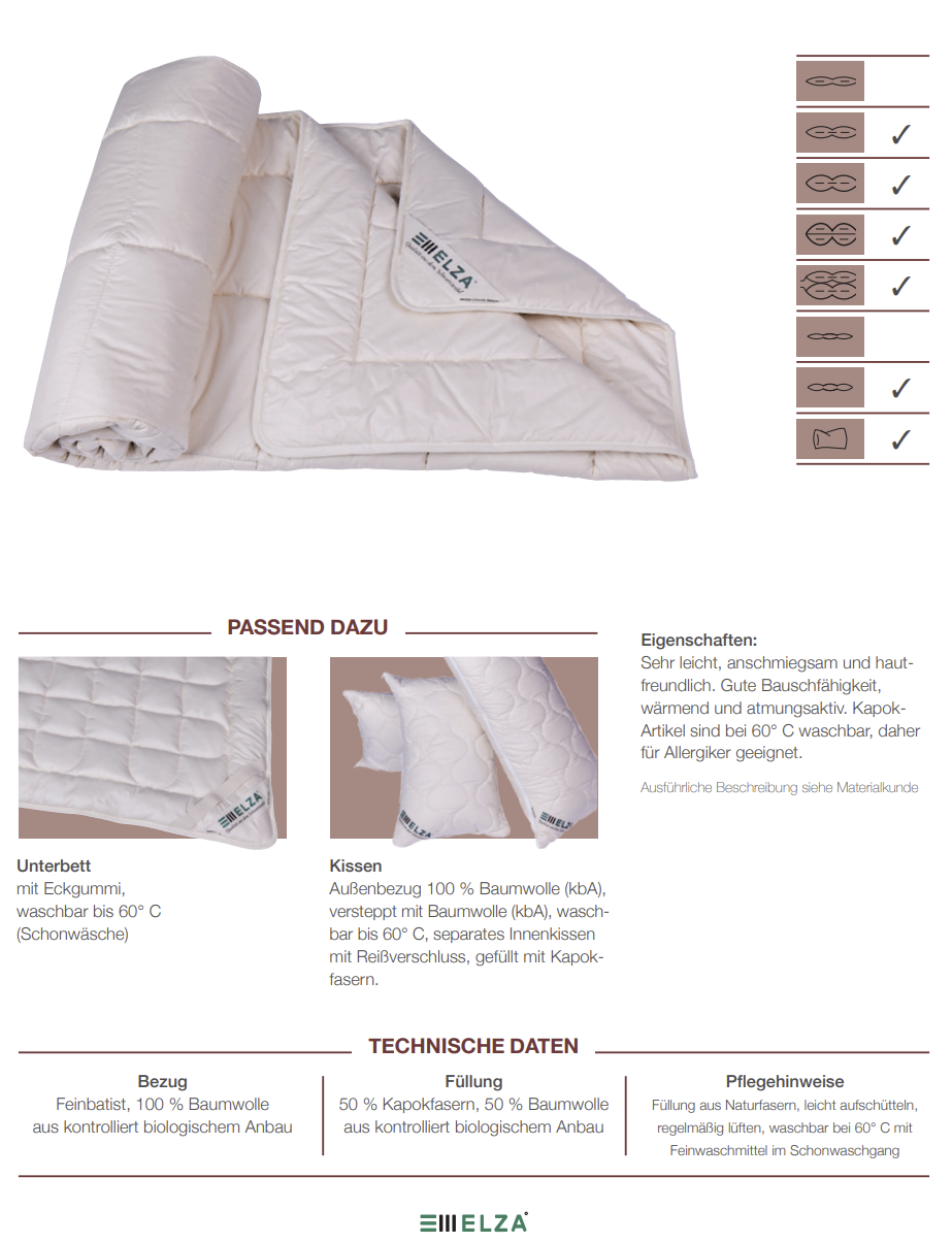 Kapok ist sehr leicht, anschmiegsam und hautfreundlich. Verfügt über gute Bauschfähigkeit, ist wärmend und atmungsaktiv. Für Allergiker geeignet, da bei 60° C waschbar.