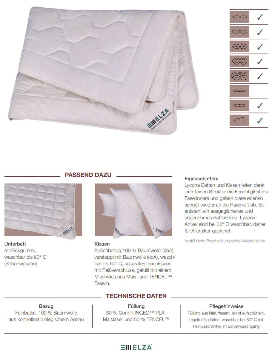 Füllung: 50 % Cornfill INGEO PLA-Maisfaser und 50 % TENCEL Bezug: Feinbatist, 100% Baumwolle aus kontrolliert biologischem Anbau Pflegehinweis: Füllung aus Naturfasern, leicht aufschütteln, regelmäßig lüften, waschbar bei 60°C mit Feinwaschmittel im Schonwaschgang Füllgewicht:Bei 135x200 cm -   800+1200 gBei 155x200 cm -   900+1350 gBei 155x220 cm -   700+1500 gBei 200x200 cm -   800+1800 gBei 200x220 cm -   900+1950 gBei 240x220 cm - 1100+2400 g Lycona Betten und Kissen leiten dank ihrer feinen Struktur die Feuchtigkeit ins Faserinnere und geben diese ebenso schnell wieder an die Raumluft ab. So entsteht ein ausgeglichenes und angenehmes Schlafklima. Lycona-Artikel sind bei 60°C waschbar, daher für Allergiker geeignet. Mais:Die Faser wird ohne chemische Zusätze aus natürlichem, nachwachsendem Rohstoff hergestellt. Im Vergleich zu Chemiefasern wird nur ein Bruchteil an Energie benötigt mit entsprechend deutlich geringerem CO2-Ausstoß. Mais-Produkte können rückstandsfrei kompostiert werden. Ökotex 100 zertifiziert. Maisvlies finden Sie z.B. in unseren Zudecken. Bei 60° waschbar und für Allergiker bestens geeignet.Eigenschaften: Für Babyartikel geeignet. Gute Wärmerückhaltung, ähnlich den Tierhaaren, da Maisfasern innen hohl sind. Geringe Neigung, Fremdgerüche anzunehmen. Hohe Bauschkraft. Tencel:TENCEL®-Fasern sind eine selbständige Faserkategorie und nicht eine Untergruppe der Viskosefasern. Ausgangspunkt ist die aus Holz gewonnene Zellulose. Es ist die erste Cellulosefaser, deren Funktionalität auf Basis von Fibrillen beruht. Fibrillen sind winzige Härchen, die hydrophil sind und somit für eine optimale Feuchtigkeitsaufnahme mit besten Klimaeigenschaften sorgen.Eigenschaften: Im Gegensatz zu synthetischen Fasern, an denen die Feuchtigkeit lediglich an der Oberfläche angelagert wird, nimmt Tencel® sie ganz auf und gibt sie dann wieder ab. Tencel® ist waschbar bis 60°, daher für Allergiker geeignet. Aus nachwachsendem Rohstoff.