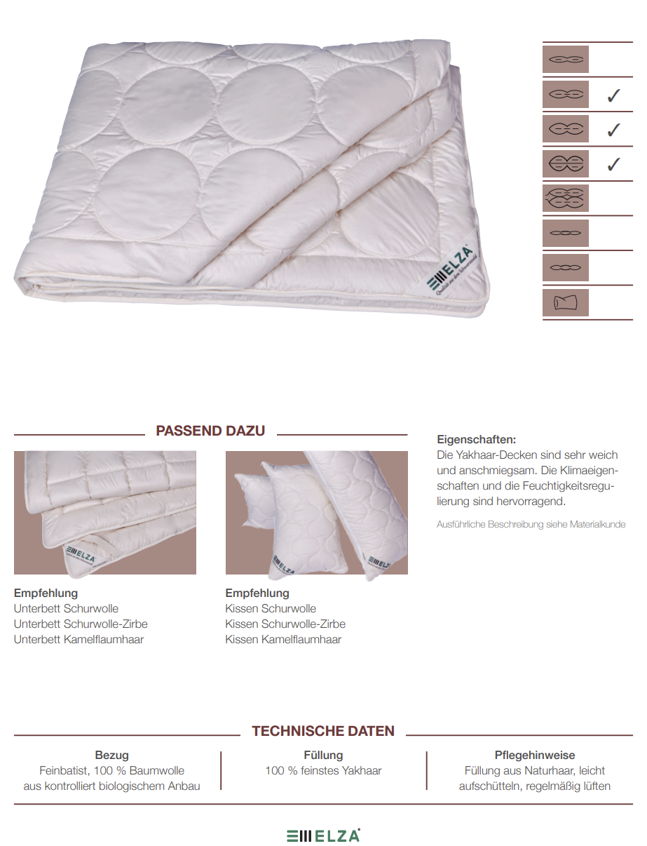 Die Yakhaar-Decken sind sehr weich und anschmiegsam. Die Klimaeigenschaften und die Feuchtigkeitsregulierung sind hervorragend. Wärmt sehr gut, mehr als Wolle, ist sehr leicht, weich und anschmiegsam.