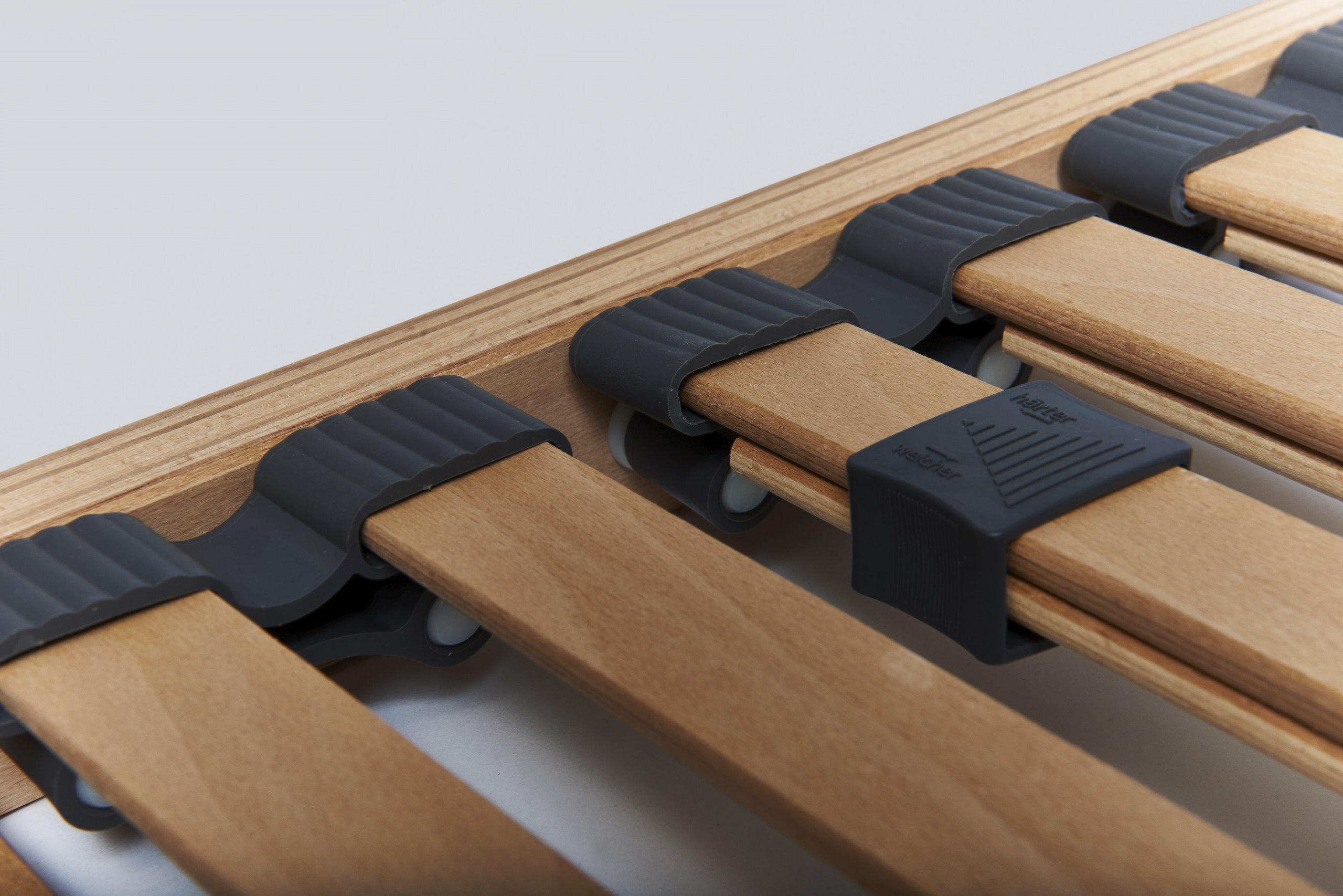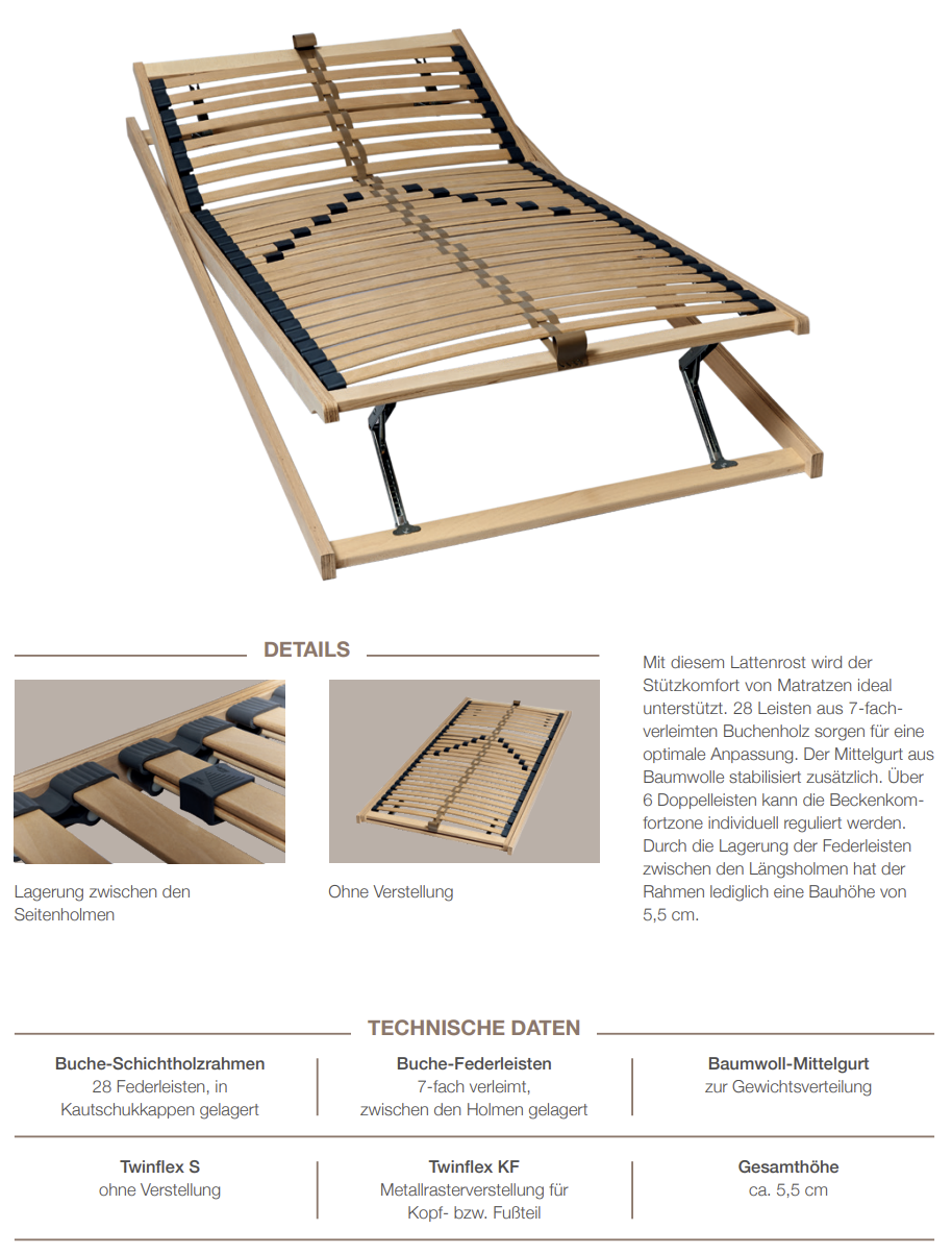Mit diesem Lattenrost wird der Stützkomfort von Matratzen ideal unterstützt. 28 Leisten aus 7-fach verleimten Buchenholz sorgen für eine optimale Anpassung. Der Mittelgurt aus Baumwolle stabilisiert zusätzlich. Über 6 Doppelleisten kann die Beckenkomfortzone individuell reguliert werden. Durch die Lagerung der Federleisten zwischen den Längsholmen hat der Rahmen lediglich eine Bauhöhe von 5,5 cm.