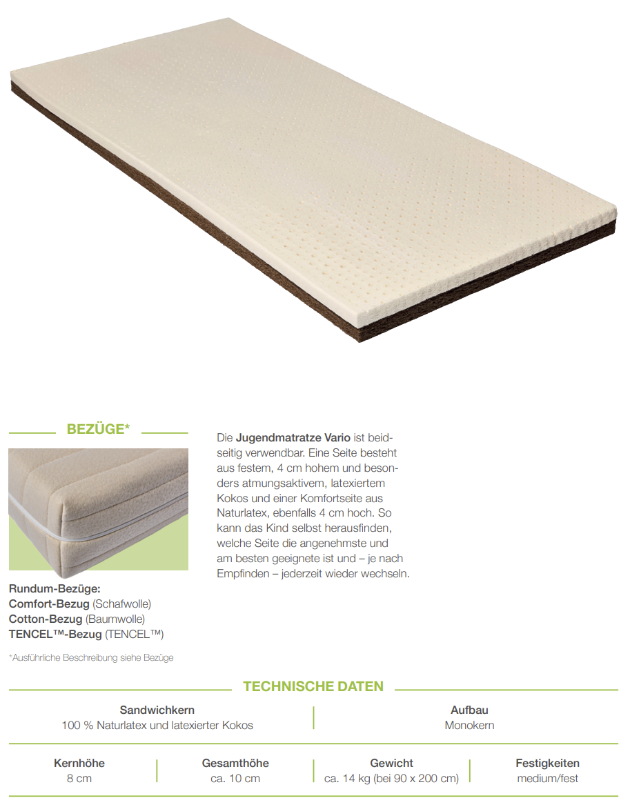 Die Jugendmatratze Vario ist beidseitig verwendbar. Eine Seite besteht aus festem, 4 cm hohem und besonders atmungsaktivem, latexiertem Kokos und einer Komfortseite aus Naturlatex, ebenfalls 4 cm hoch. So kann das Kind selbst herausfinden, welche Seite die angenehmste und am besten geeignete ist und - je nach Empfinden - jederzeit wieder wechseln.