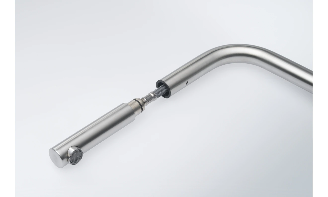 - Massiv-Edelstahl radial gebürstet mit hohem Auslauf