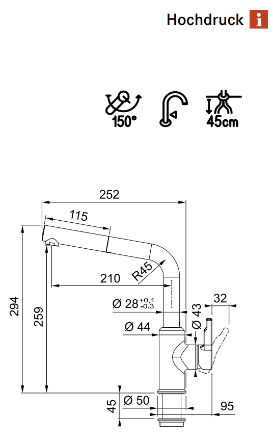 - Armatur URBAN Zugauslauf, L-Form, Seitenbedienung, Hochdruck,