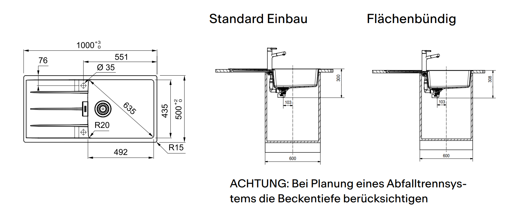 - Spüle ist sowohl als Einbau & Flächenbündige Variante einbaubar - ab 60 cm Unterschrank