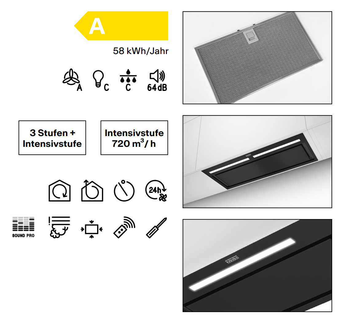Abweichende Werte bei 52 cm: Energieeffizienzklasse B, Intensivstufe 670 m3/h, 66 dB in der dritten Leistungsstufe