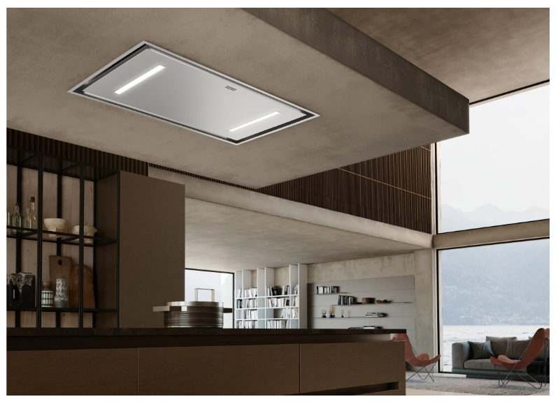 - Platzsparende und dezente Dunstabzugslösung zur Montage direkt an der Decke