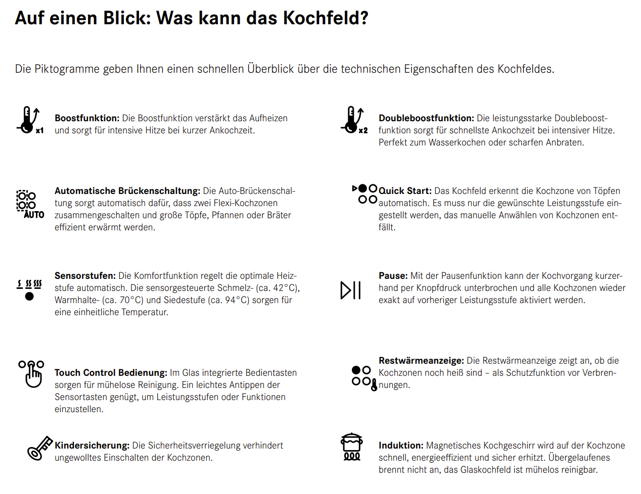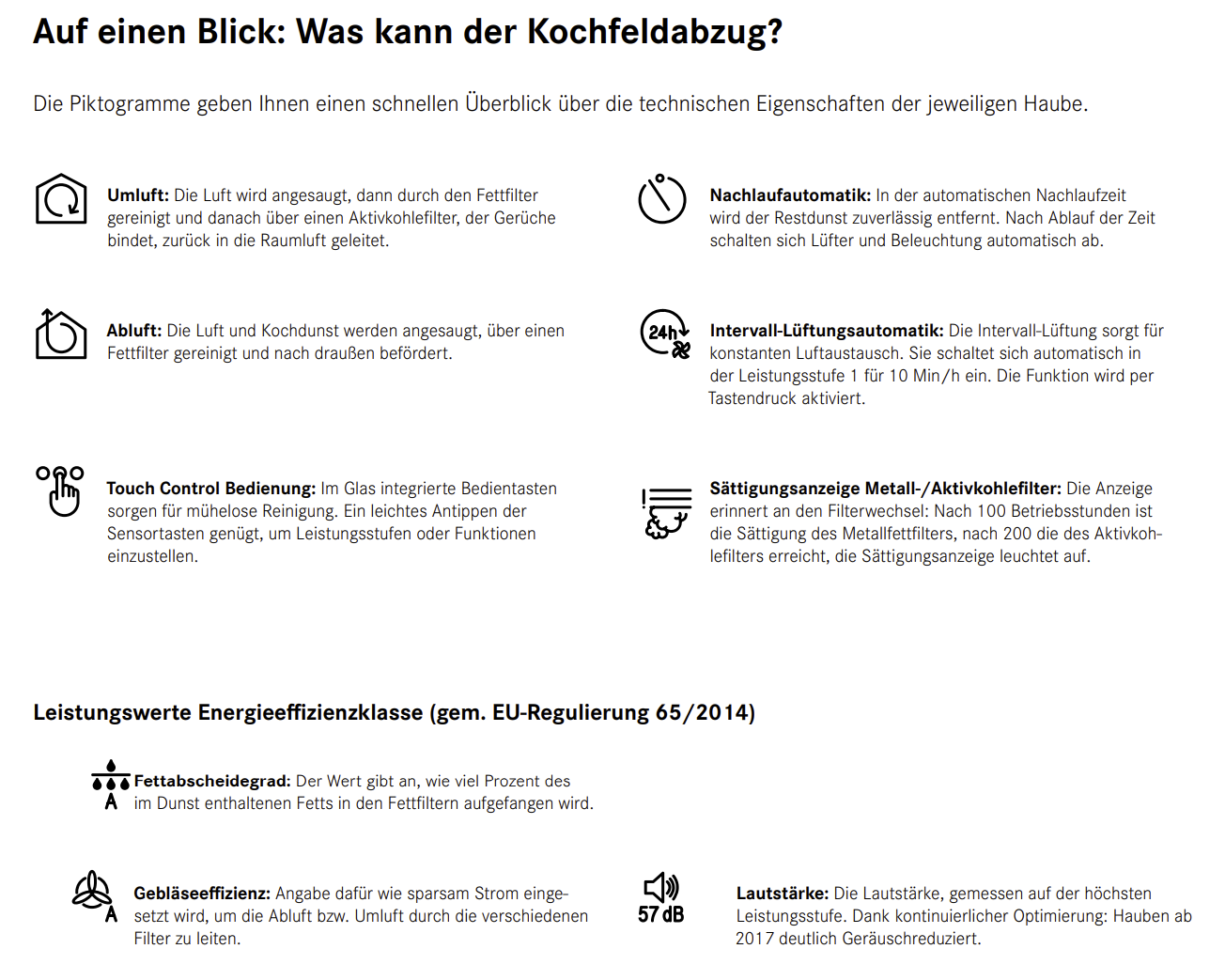 Die Erklärung der Piktogramme finden Sie unter Downloads - Was kann der Kochfeldabzug?