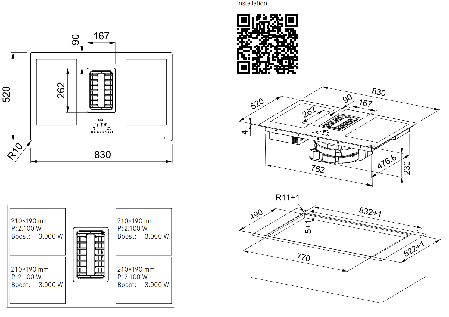 2 Kochzonen 210 x 190 mm / 2.100 W (3.000 W*)