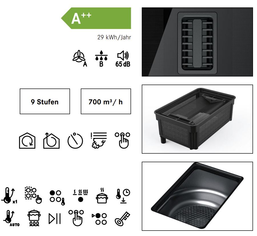 Produktbeschreibung ? intuitive sControl Bedienung ? niedrigste Lautstärke ? leichte Reinigung ? integrierte Fettauffangwanne ? übergroße Kochfläche 4 24 ? maximaler Stauraum ? kompakte Größe ? automatische Abzugssteuerung ? großzügige Überlaufwanne ? Demomodus