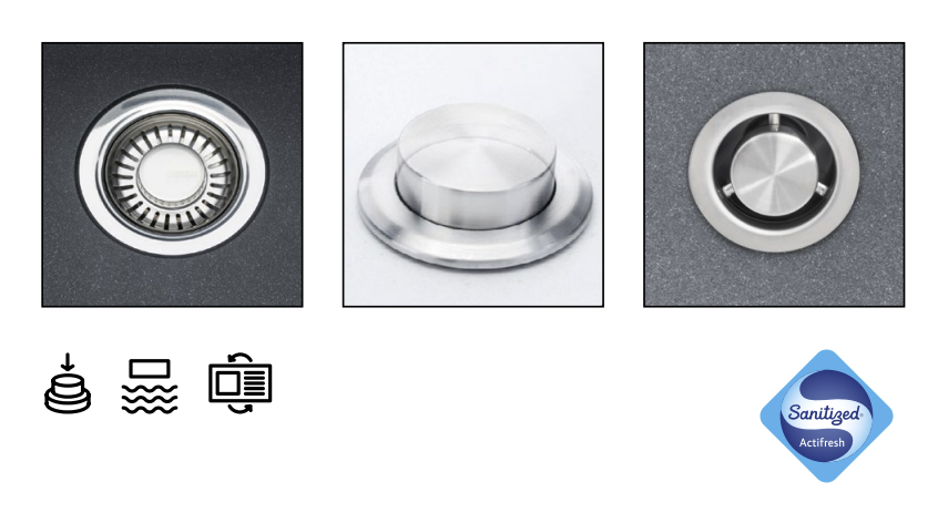 - Siebkorb als Druckknopfventil, mit verdecktem Überlauf und Abtropfbecken Edelstahl