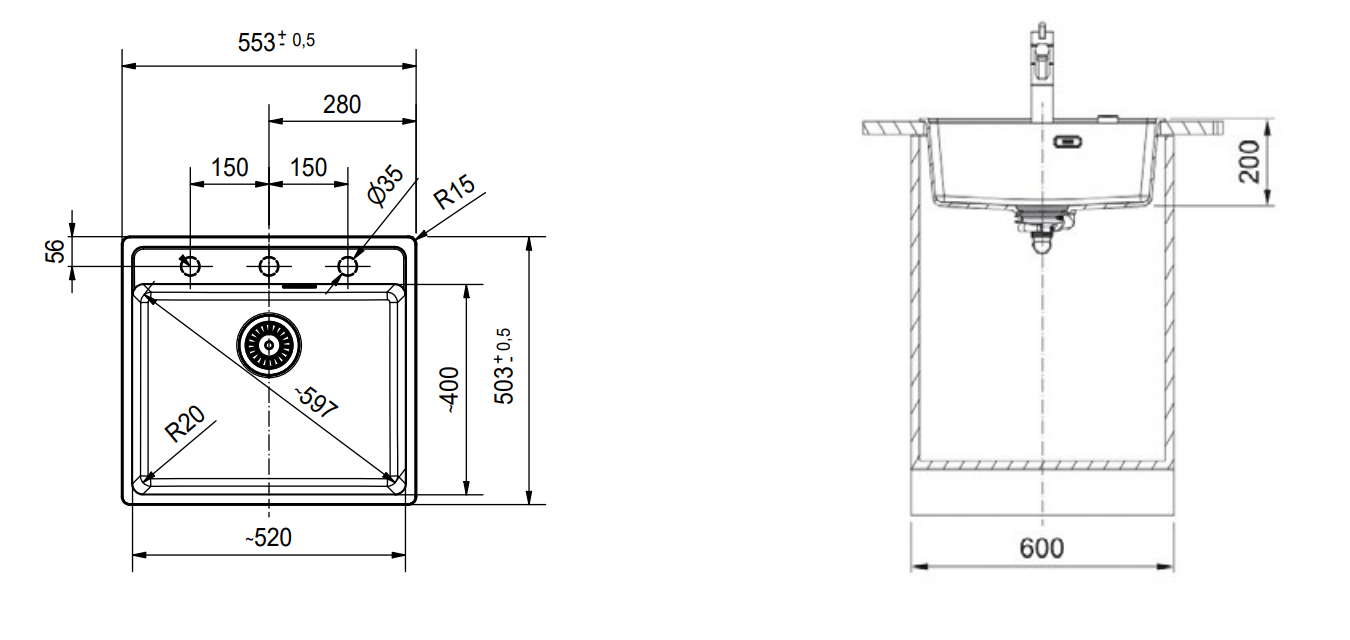 Beckenaußenmaß: 560x500mm Becken: 503x425x220mm Arbeitsplattenstärke Einbau: mind. 30mm Flächenbündig: mind. 38mm Ausschnitt Einbau: 540x480mm R15 Ausschnitt Flächenbündig: siehe Montageanleitung Lieferumfang: inkl. Ablaufgarnitur Distanzring zum Befestigen der Armatur ist im Ventilbeipack enthalten