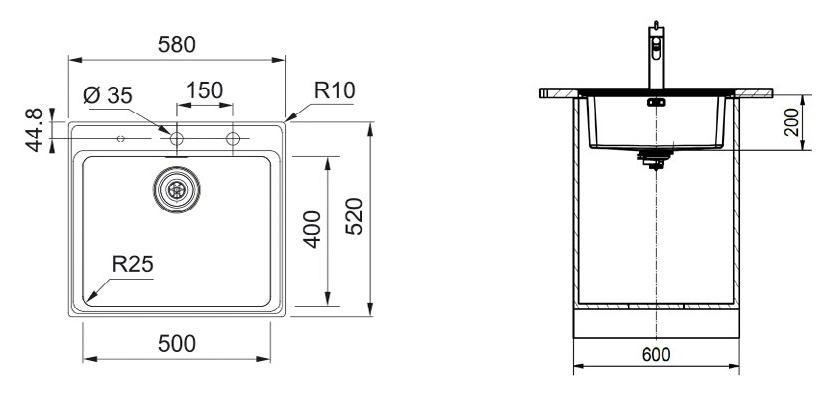 Beckenaußenmaß: 580x520mm