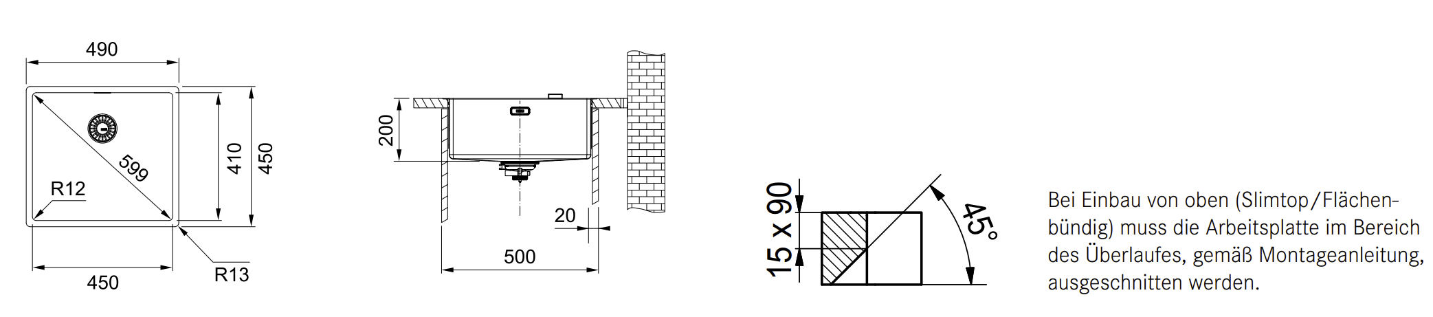 Arbeitsplattenstärke: mind. 12mm