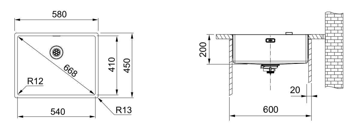 - Spülenmaß: 580 x 450 mm