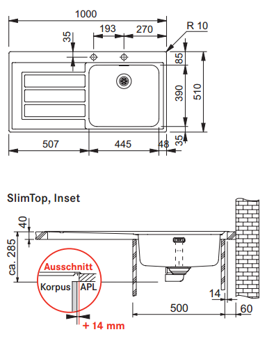 Ausschnitt Slimtop: 990x500 mm R10