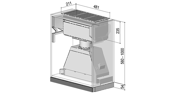 Als Alternative zum BUF 125+ hat berbel ein geschlossenes Filtersystem als Schrankeinbau entwickelt. Auf dem Lüfterstutzen der Einbauhaube sitzt kein Aktivkohlefilter, sondern ein Umluftfilterkasten. Seine Füllung kann alle 2 Jahre gewechselt werden, ohne dass der Filter getauscht werden muss.