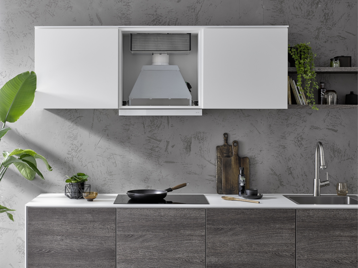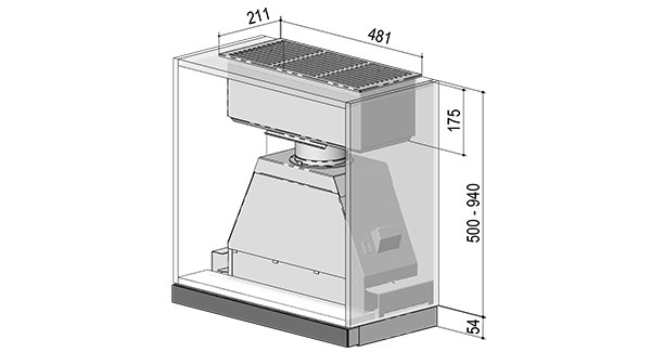 Das Produktbild zeigt eine beispielhafte Einbausituation des eingebauten Umluftlifterkasten BGU 125, welcher auf der Einbauhaube aufgesetzt ist.