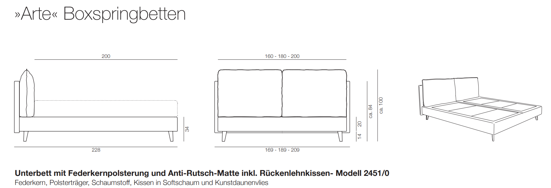 Das weiche Kopfhaupt aus losen Kissen mit abnehmbaren Bezügen überzeugt durch seine Anschmiegsamkeit und seinen Variantenreichtum. Dieses Bett besticht außerdem durch seine »Leichtfüßigkeit«, eine Eigenschaft, die Sie bei klassischen Bosxpringbetten nicht finden werden. Passend zum leichtfüßigen Boxspringbett Arte wurde ein »schwebendes« Nachtkästchen entworfen. Die Seitenteile können im gleichen Stoff wie das Bett bezogen werden.