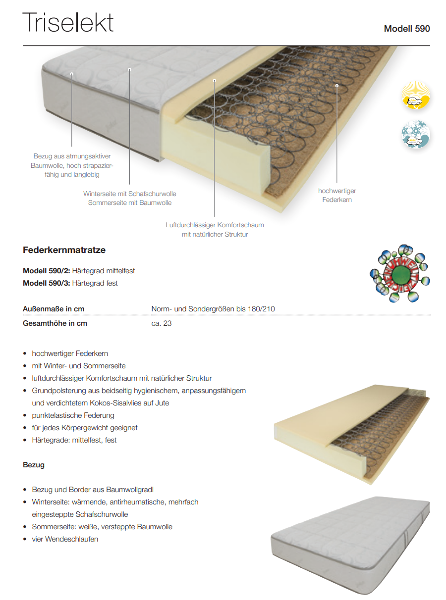 Die Matratze Triselekt mit Winter- und Sommerseite verbindet all diese Eigenschaften gekonnt. Sie umgibt luftdurchlässiger Komfortschaum mit einer natürlichen Struktur. Die Grundpolsterung ist aus beidseitig hygienischem, anpassungsfähigem und verdichtetem Kokos-Sisalvlies auf Jute. Zwei Härtegrade stehen zur Auswahl: mittelfest, fest