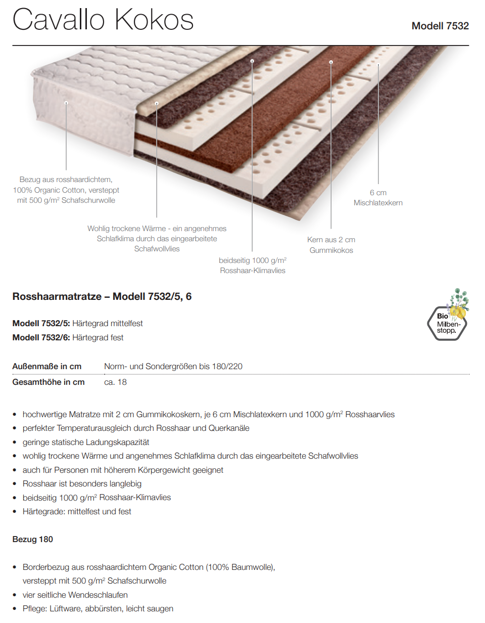 Cavallo Kokos ist eine hochwertige Matratze mit einem Gummikokoskern, der beidseitig von Mischlatex, einem Schafwoll- und einem Roßhaarvlies umschlossen ist. Das Roßhaar sorgt für einen perfekten Temperaturausgleich, die Schafwolle für wohlige Wärme. Schafwolle wirkt geruchsneutralisierend, ist von Natur aus antibakteriell und reinigt sich von selbst, wenn sie von Bakterien und Schmutz befallen wird. Rosshaar ist im Winter angenehm warm, im Sommer sorgt es für Kühle. Außerdem ist Roßhaar sehr langlebig.