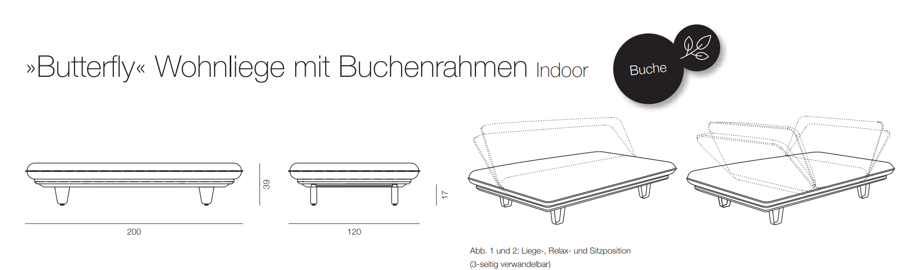 Die Wohnliege "Butterfly" ist das perfekte Tagesbett. Aber nicht nur das, die Liege kann an drei Seiten in zwei Stellungspositionen hochgeklappt werden. Somit haben Sie eine Vielzahl an Möglichkeiten, es sich im Wohnzimmer bequem zu machen.