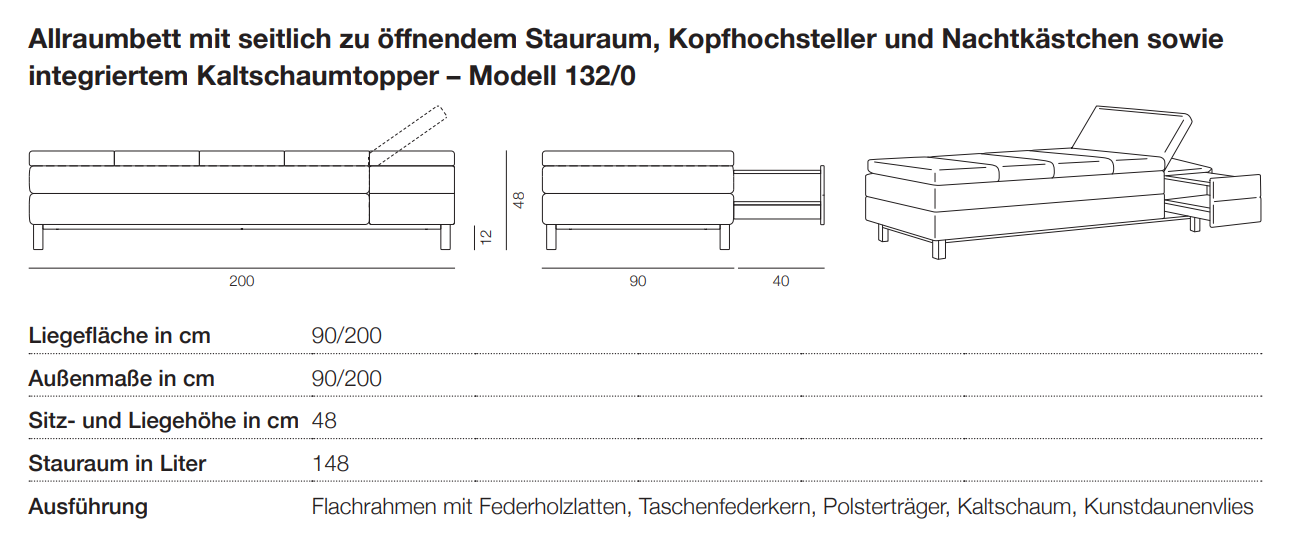 - Allraumbett mit seitlich zu öffnendem Stauraum, Kopfhochsteller und Nachtkästchen inkl. Kaltschaumtopper