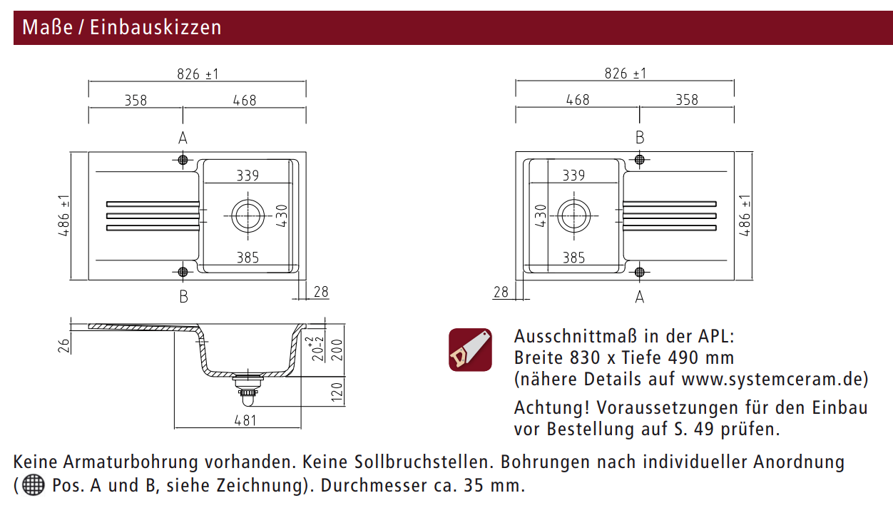 - Keine Armaturbohrung vorhanden. Keine Sollbruchstellen. Bohrungen nach individueller Anordnung ( Pos. A und B, siehe Zeichnung). Durchmesser ca. 35 mm.