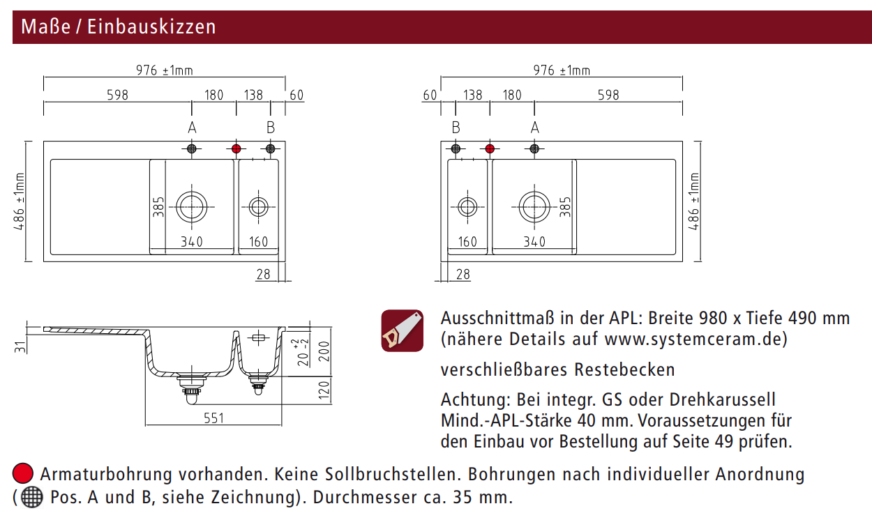 - Ausschnittmaß in der APL: Breite 980 x Tiefe 490 mm