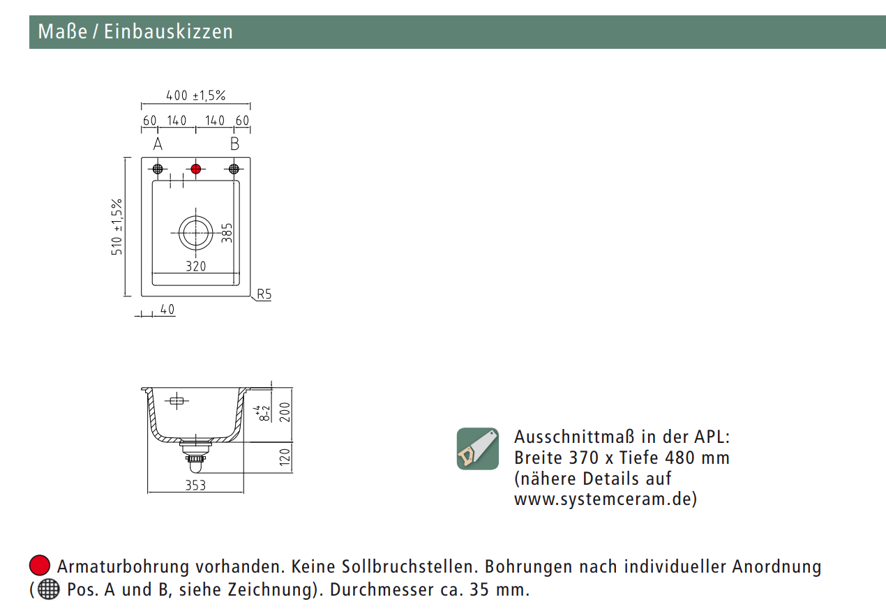 - Ausschnittmaß in der APL: Breite 370 x Tiefe 480 mm