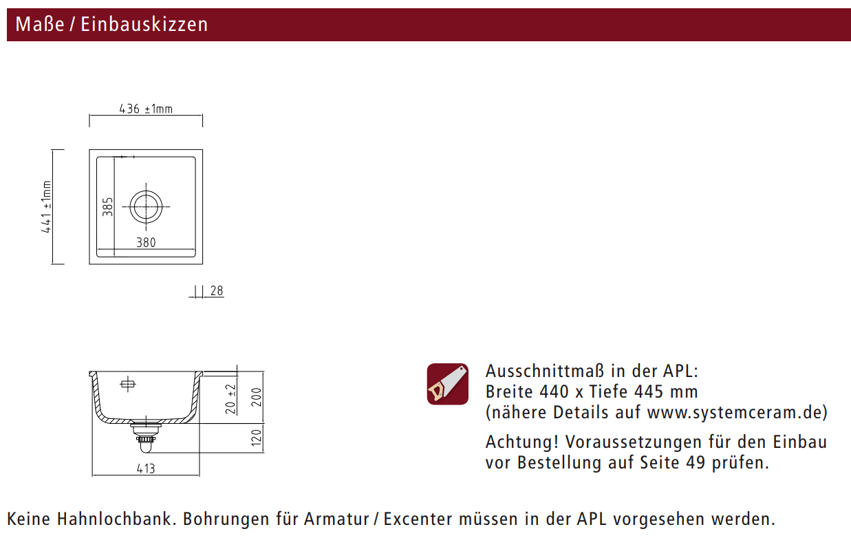 - Keine Hahnlochbank. Bohrungen für Armatur / Excenter müssen in der APL vorgesehen werden