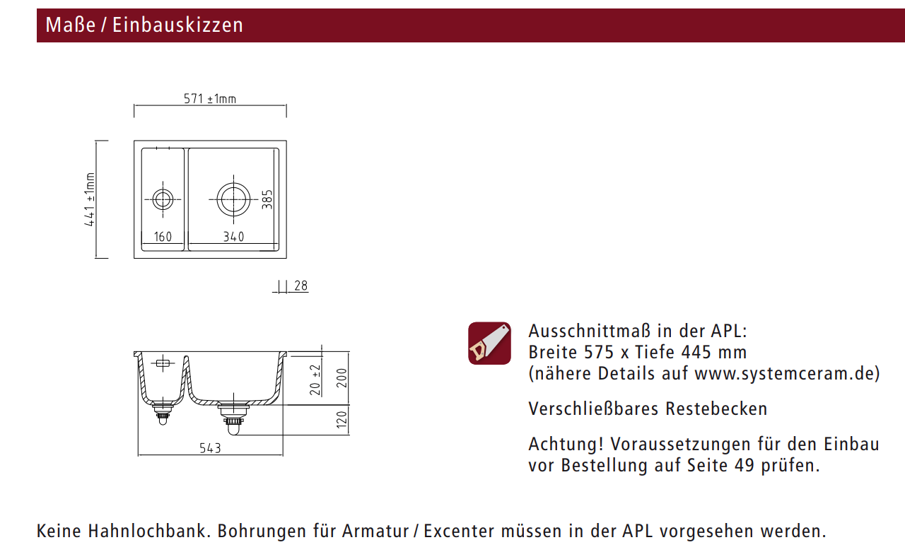 - Keine Hahnlochbank. Bohrungen für Armatur / Excenter müssen in der APL vorgesehen werden