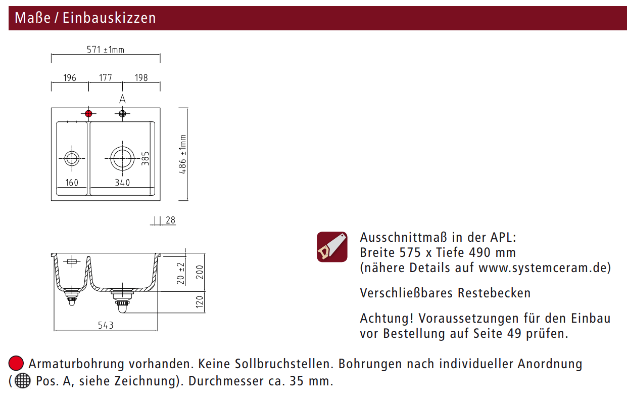 - Armaturbohrung ? vorhanden. Keine Sollbruchstellen. Bohrungen nach individueller Anordnung ( Pos. A, siehe Zeichnung). Durchmesser ca. 35 mm.
