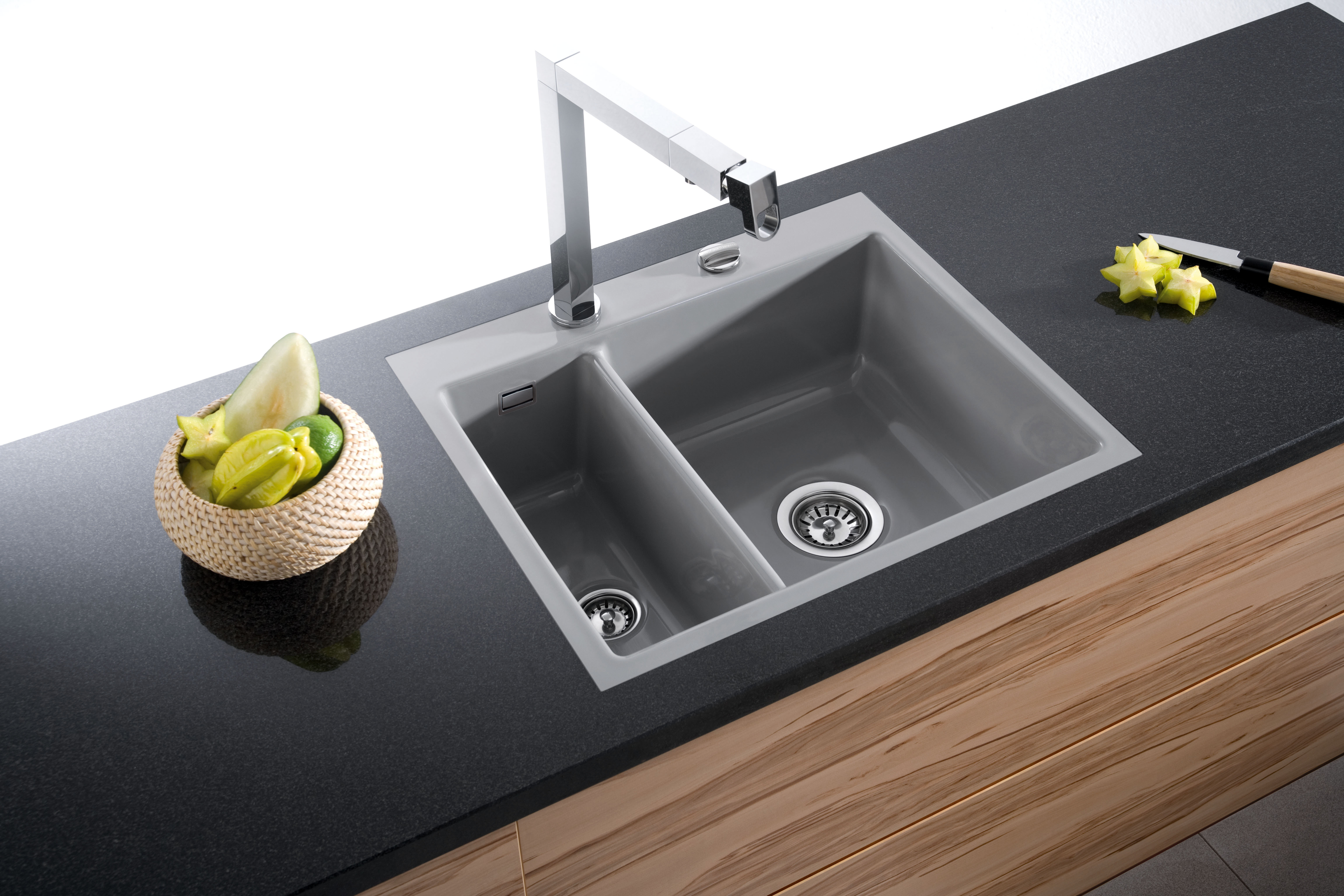 Zu einem klassischen Design kann niemand nein sagen. Die Mera 60 F mit Doppelbecken, passend für 60er-Einbauschränke, eignet sich hervorragend für Liebhaber der Ordnung. Die fix positionierte Spüle ist asymmetrisch aufgeteilt, wodurch zwei unterschiedlich große Becken entstehen. Das schmale Becken fungiert hierbei ideal als Unterstützung beim Waschen und Putzen von Obst und Gemüse, besonders in Kombination mit der perfekt passenden Resteschale.