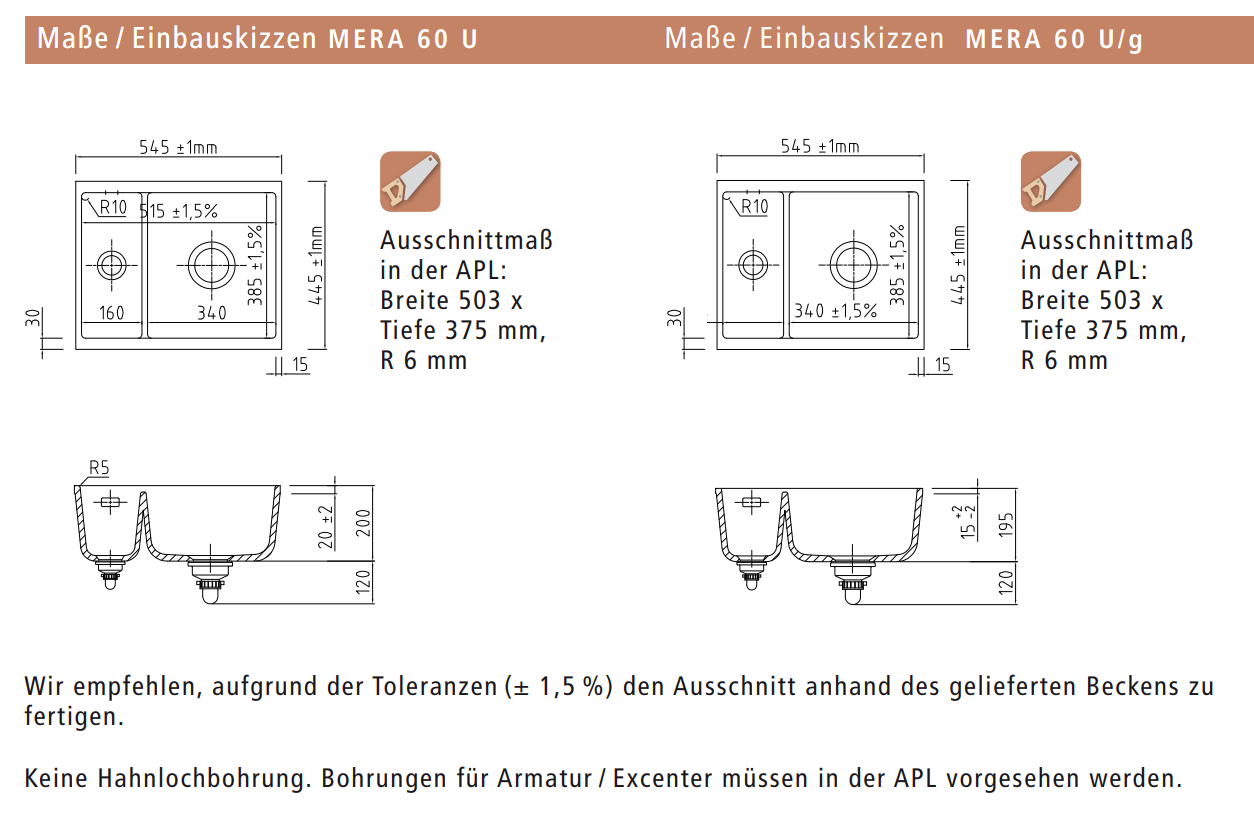 - Wir empfehlen, aufgrund der Toleranzen (± 1,5 %) den Ausschnitt anhand des gelieferten Beckens zu fertigen.