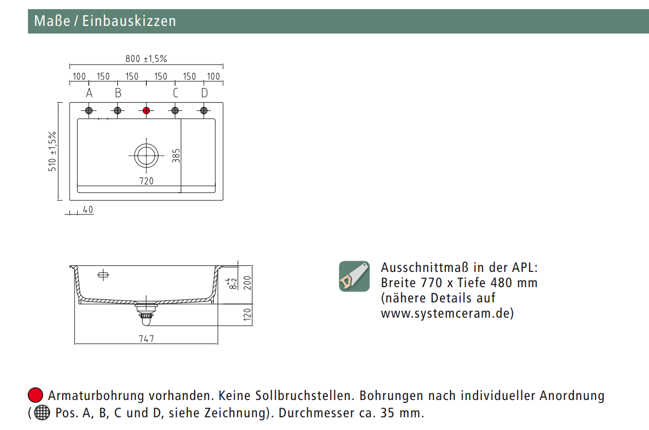- Armaturbohrung ? vorhanden. Keine Sollbruchstellen. Bohrungen nach individueller Anordnung (Pos. A, B, C und D, siehe Zeichnung). Durchmesser ca. 35 mm.