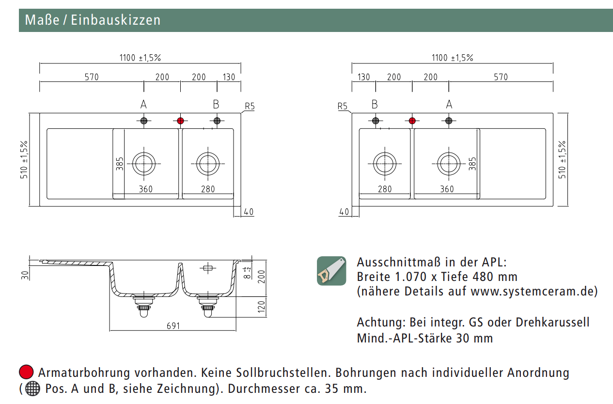 - Armaturbohrung ? vorhanden. Keine Sollbruchstellen. Bohrungen nach individueller Anordnung ( Pos. A und B, siehe Zeichnung). Durchmesser ca. 35 mm.