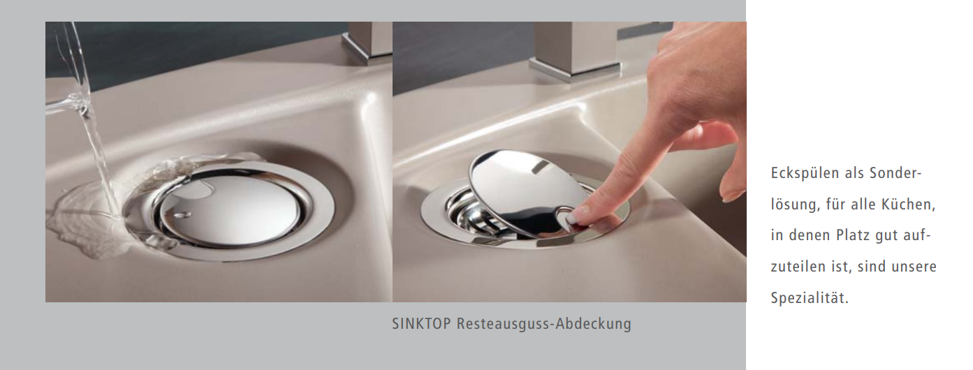 - inkl. Ablaufgarnitur mit Handbetätigung und Sinktop Resteausguss-Abdeckung oder