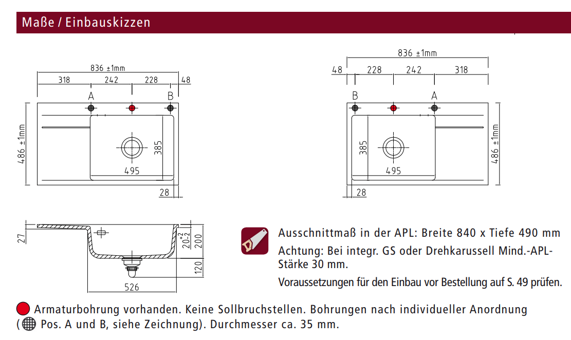- Armaturbohrung ? vorhanden. Keine Sollbruchstellen. Bohrungen nach individueller Anordnung (Pos. A und B, siehe Zeichnung). Durchmesser ca. 35 mm.