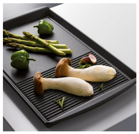 geriffelte Bratfläche, ermöglicht ein fettarmes bzw. fettfreies Garen. Die typischen dunklen Grillstreifen sind insbesondere bei Gemüse ein optischer Genuss.