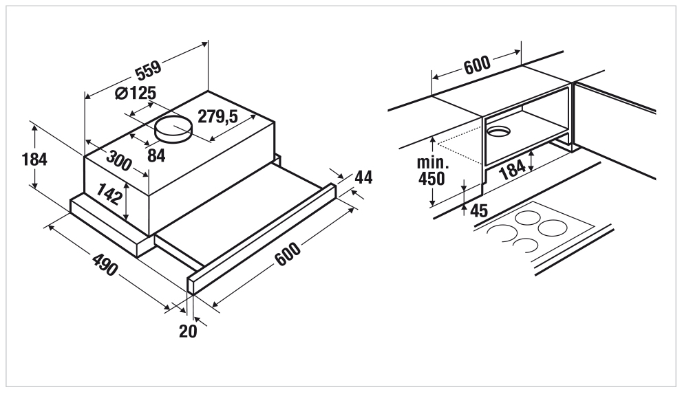 - Gerätemaße: B x H x T ca. 600 x 184 x 300-490 mm