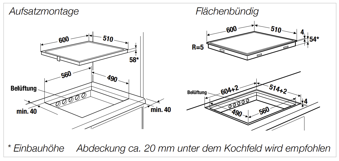 - Gerätemaße B x T ca. 600 x 510 mm Einbauhöhe 58 mm