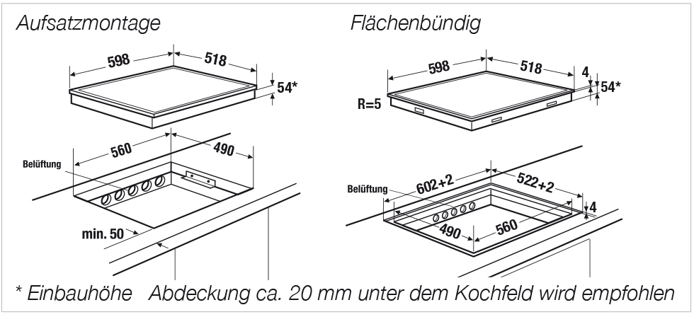 Einbauhöhe 54 mm - Ausschnittmaße B x T ca. 560 x 490 mm