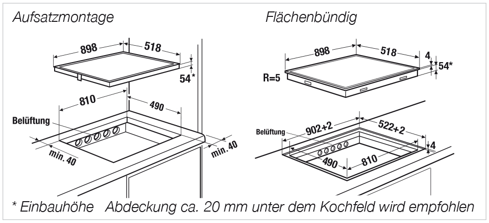 Einbauhöhe 54 mm - Ausschnittmaße B x T ca. 810 x 490 mm