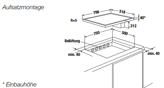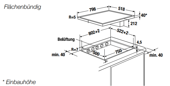 - Ausschnittmaße B x T ca. 750 x 500 mm (für flächenbündigen Einbau bitte Maßzeichung beachten)